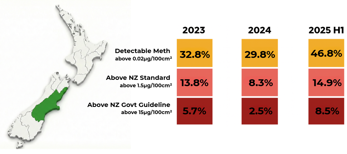 - Around 30–47% of properties across the Canterbury region show detectable meth levels above 0.02µg/100cm²